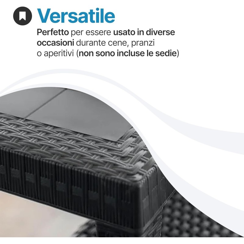 Il Tavolo in plastica effetto rattan Dallas è realizzato in polipropilene di alta qualità, un materiale plastico resistente ai raggi UV e alle intemperie. La finitura effetto rattan sintetico dona un aspetto moderno ed elegante, ideale per giardino esterno, patio, veranda e dehor. La struttura è pensata per un utilizzo quotidiano in contesti domestici e professionali come bar, ristoranti, pizzerie e locali contract. Grazie alle quattro gambe smontabili, il tavolo è facile da riporre e perfetto per chi ha poco spazio. È una soluzione pratica per pranzi, cene e momenti conviviali all’aria aperta, anche in casa al mare o in montagna.