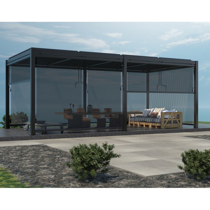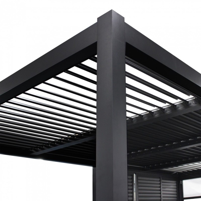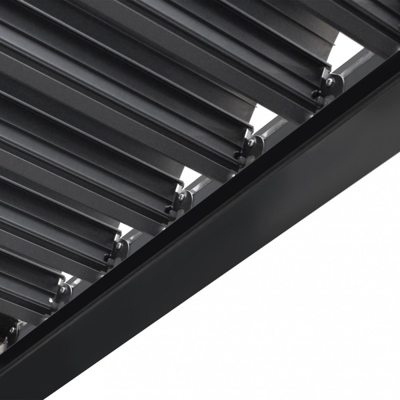 Struttura in alluminio bianco o grigio scuro copertura a lamelle frangisole orientabili a movimentazione manuale resistente a tutte le intemperie Dimensioni: m 7,8 x 4 x 2,5 h SKU: GA802141-DGRE EAN: 8057635313380