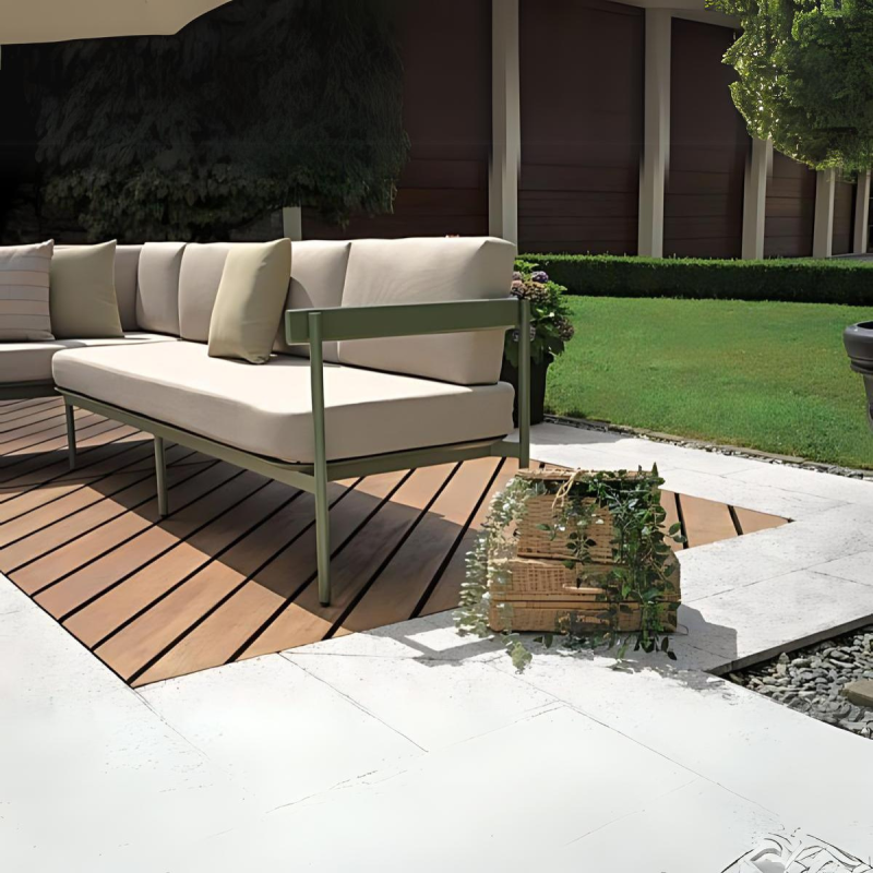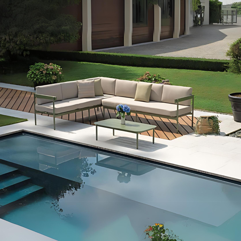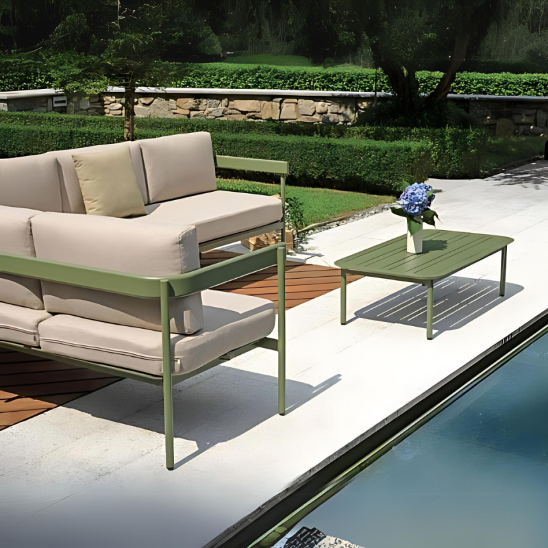 Il Salotto da esterno angolare Torvaianica è la soluzione perfetta per chi desidera creare uno spazio di relax e convivialità all’aperto. Grazie al suo design angolare, questo set si adatta facilmente a qualsiasi ambiente esterno, offrendo non solo eleganza, ma anche grande funzionalità. Realizzato in alluminio verde, resistente agli agenti atmosferici, questo salotto è ideale per chi cerca una soluzione duratura e pratica per arredare il proprio giardino o terrazzo. Il salotto è composto da due divani a tre posti, uno dei quali può essere trasformato in un lettino grazie allo schienale regolabile, e un tavolino con piano a doghe di 110x60 cm, perfetto per appoggiare bevande, libri o altri oggetti durante i tuoi momenti di relax. I cuscini sfoderabili color sabbia aggiungono un tocco di eleganza e sono facili da pulire, garantendo comfort e praticità.