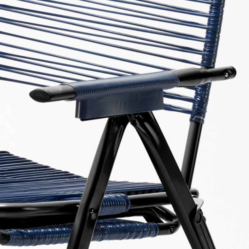 La seduta è realizzata con cordonatura in filo plastico anallergico, materiale resistente e facile da pulire. La struttura a corda favorisce la traspirazione e si asciuga rapidamente, rendendo la poltrona adatta anche all’uso esterno.