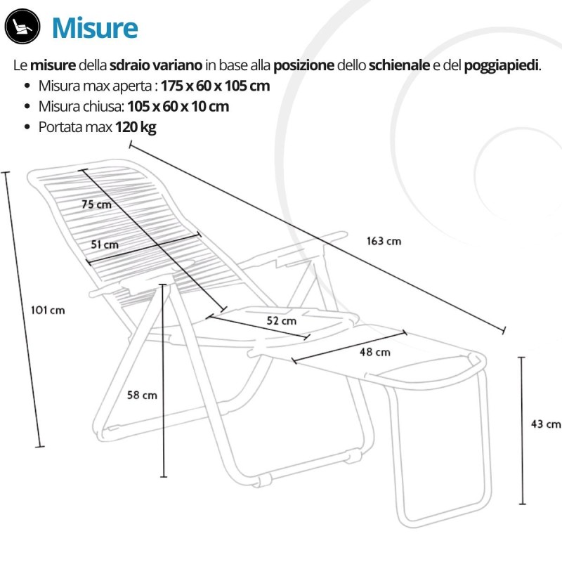 Questa poltrona relax pieghevole è adatta sia per ambienti interni che per spazi esterni. Perfetta per giardino, terrazza, veranda, balcone o casa vacanze. Quando non utilizzata, si richiude facilmente occupando poco spazio.