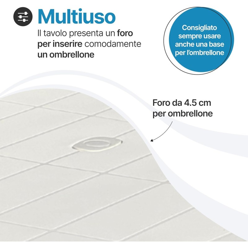 Il foro centrale consente l’inserimento di un ombrellone e permette di creare una zona d’ombra stabile nelle giornate soleggiate.