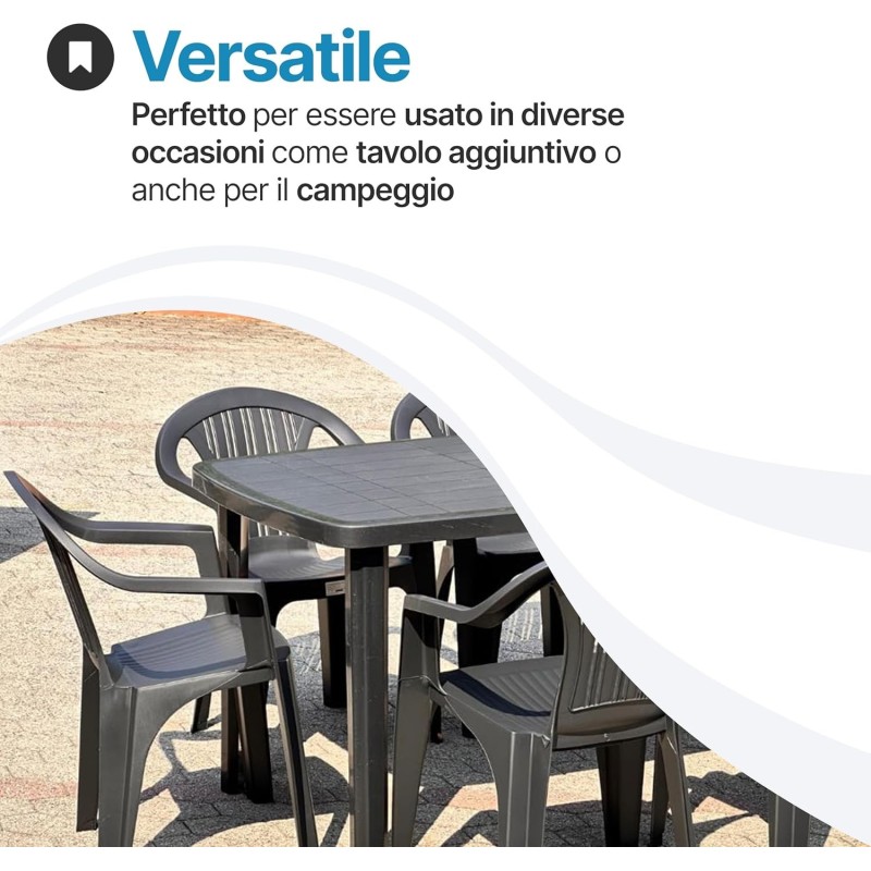 La forma neutra e la struttura robusta permettono l’abbinamento con la maggior parte delle sedie da giardino in plastica o resina. È indicato per abitazioni private e per contesti professionali come campeggi, case vacanza, bar, stabilimenti balneari e aree hospitality.