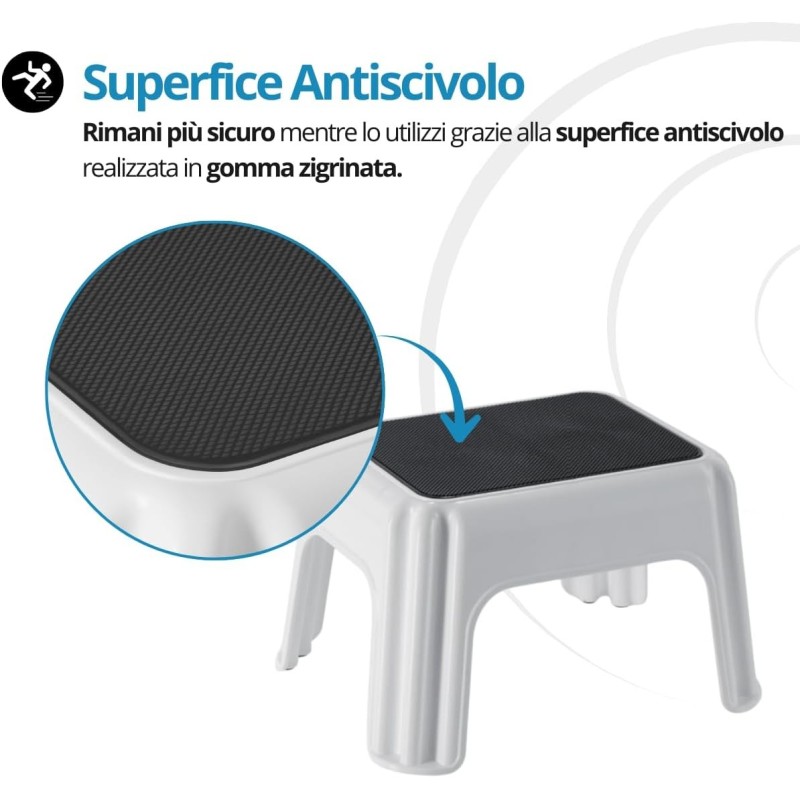Uno scalino stabile e sicuro è fondamentale nella vita quotidiana. Questo sgabello in plastica antiscivolo permette di raggiungere facilmente lavandino, WC, mensole e ripiani alti evitando soluzioni improvvisate e poco sicure.