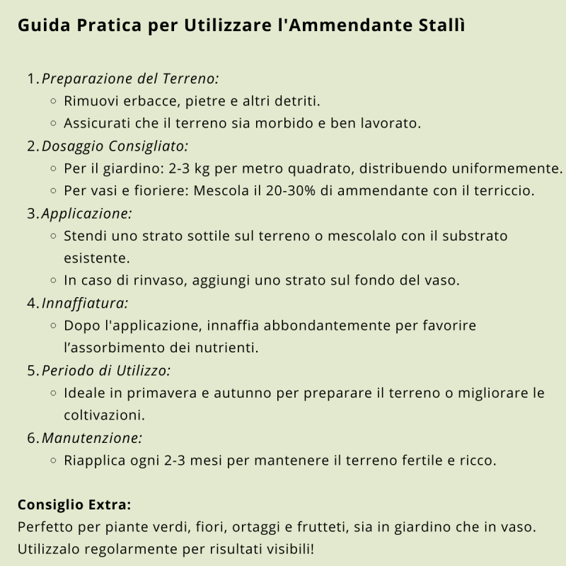 Ammendante Stallì concime organico ideale per migliorare la struttura del terreno e nutrire piante, fiori e ortaggi. Perfetto per giardino, vaso e balcone, biologico e naturale