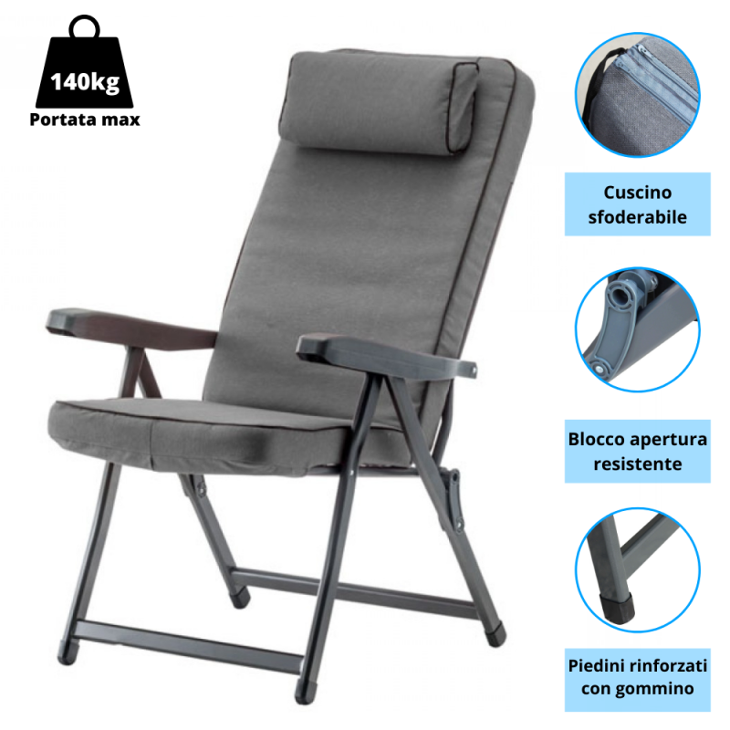 • Sdraio reclinabile in 5 posizioni con meccanismo di blocco sui braccioli