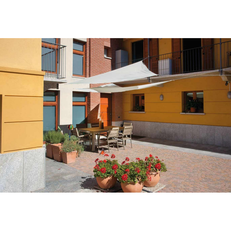 Perfetta per creare zone d'ombra dove potersi rilassarsi e godersi a pieno le giornate più soleggiate durante la bella stagione. Arricchisce il vostro giardino creando un angolo accogliente e ombreggiato dove poter organizzare pranzi, cene aperitivi o delle feste proteggendoti dai raggi ultravioletti del sole. Struttura formata da una vela triangolare in tessuto plastificato in filato di poliestere , semi impermeabile e resistente alle intemperie, offre un ottima protezione dai raggi UV ed è ombreggiante al 95%. Il tessuto è semplice da pulire, il materiale in poliestere da 180gr si può lavare!