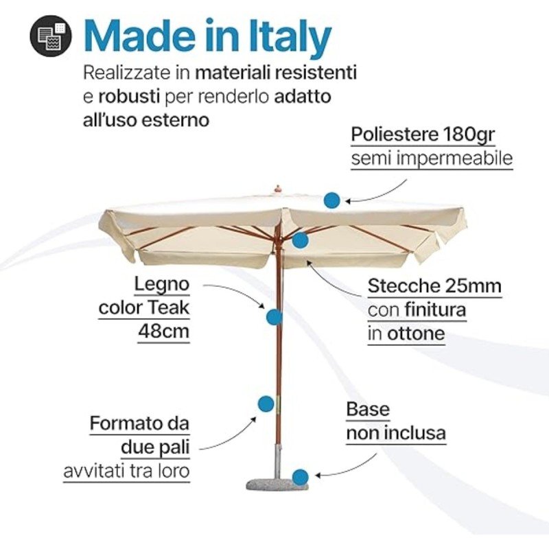 Data la dimensione 3x3, è fondamentale utilizzare una base pesante e proporzionata per garantire la massima stabilità. In caso di vento forte o condizioni meteo avverse si consiglia di chiudere l’ombrellone per preservarne la durata.